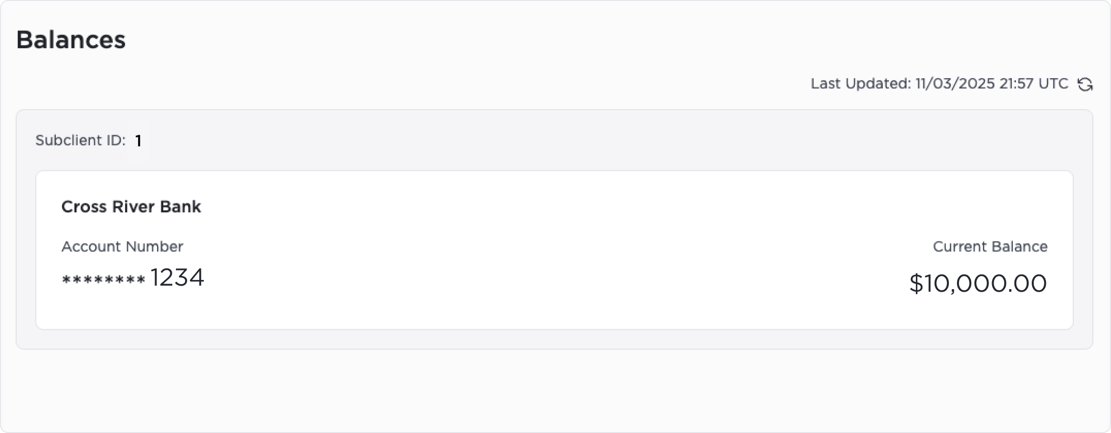 Balances visibility is currently limited to clients with subledger accounts held at a select partner bank. For updates, refer to Upcoming Enhancements, or follow the Changelog.
