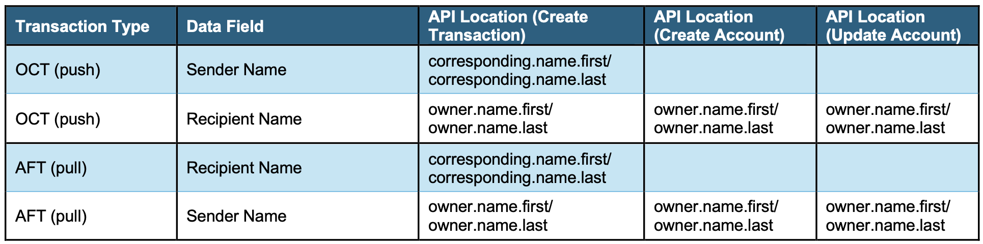 As part of upcoming Visa Direct compliance changes, please review the following data requirements that apply to your use of TabaPay for Visa Person-to-Person (P2P), Account-to-Account (A2A), and Business-to-Consumer transactions. Proper population of name fields is critical to avoid processing errors, downstream declines, and potential compliance violations.