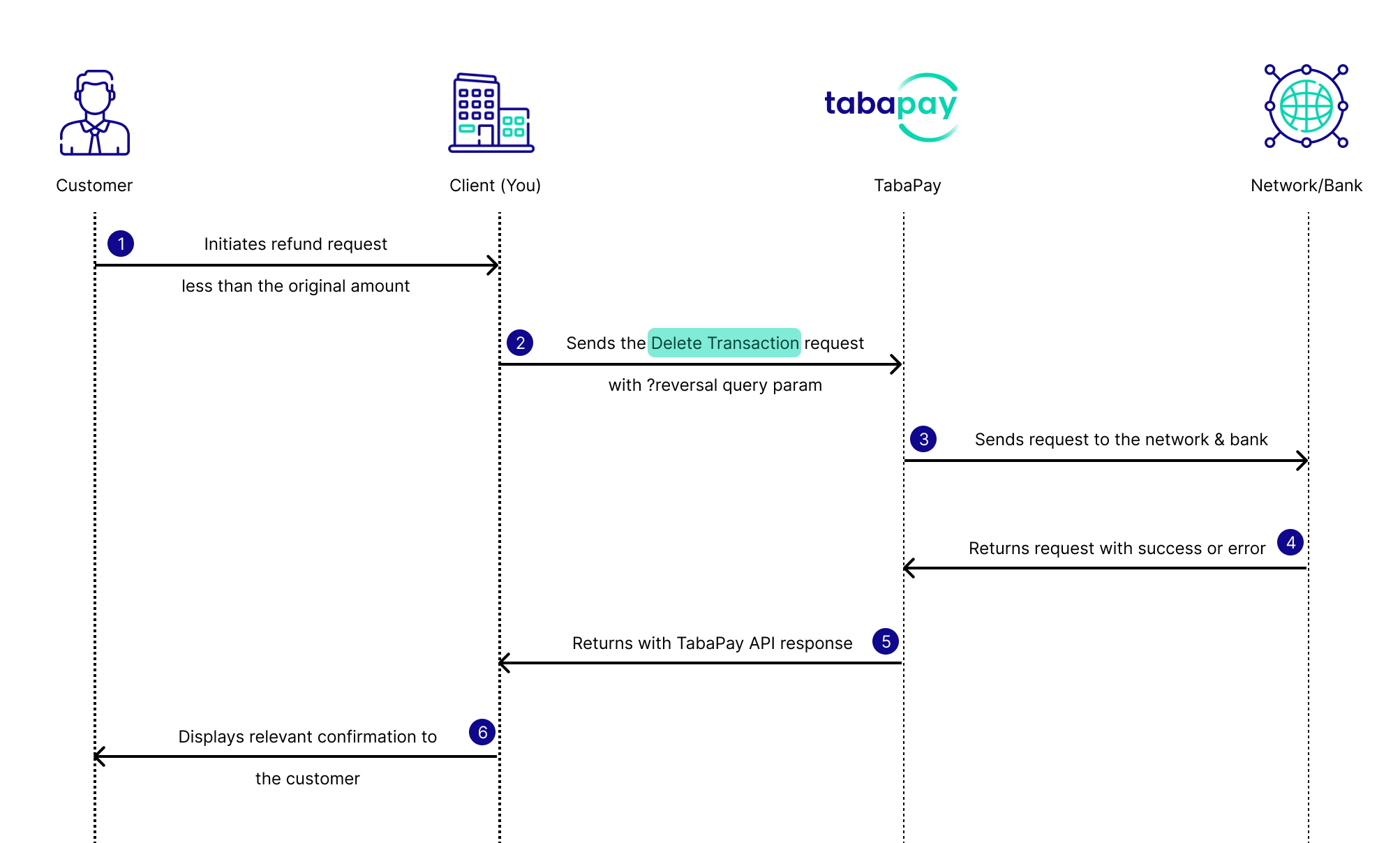 Multiple Reversals is feature for pull payments that allows the ability to create multiple attempts to reverse a transaction. Reversal attempts can be made up to the total original transaction amount. This can be initiated by both the TabaPay API using Delete Transaction with the query parameter ?reversal