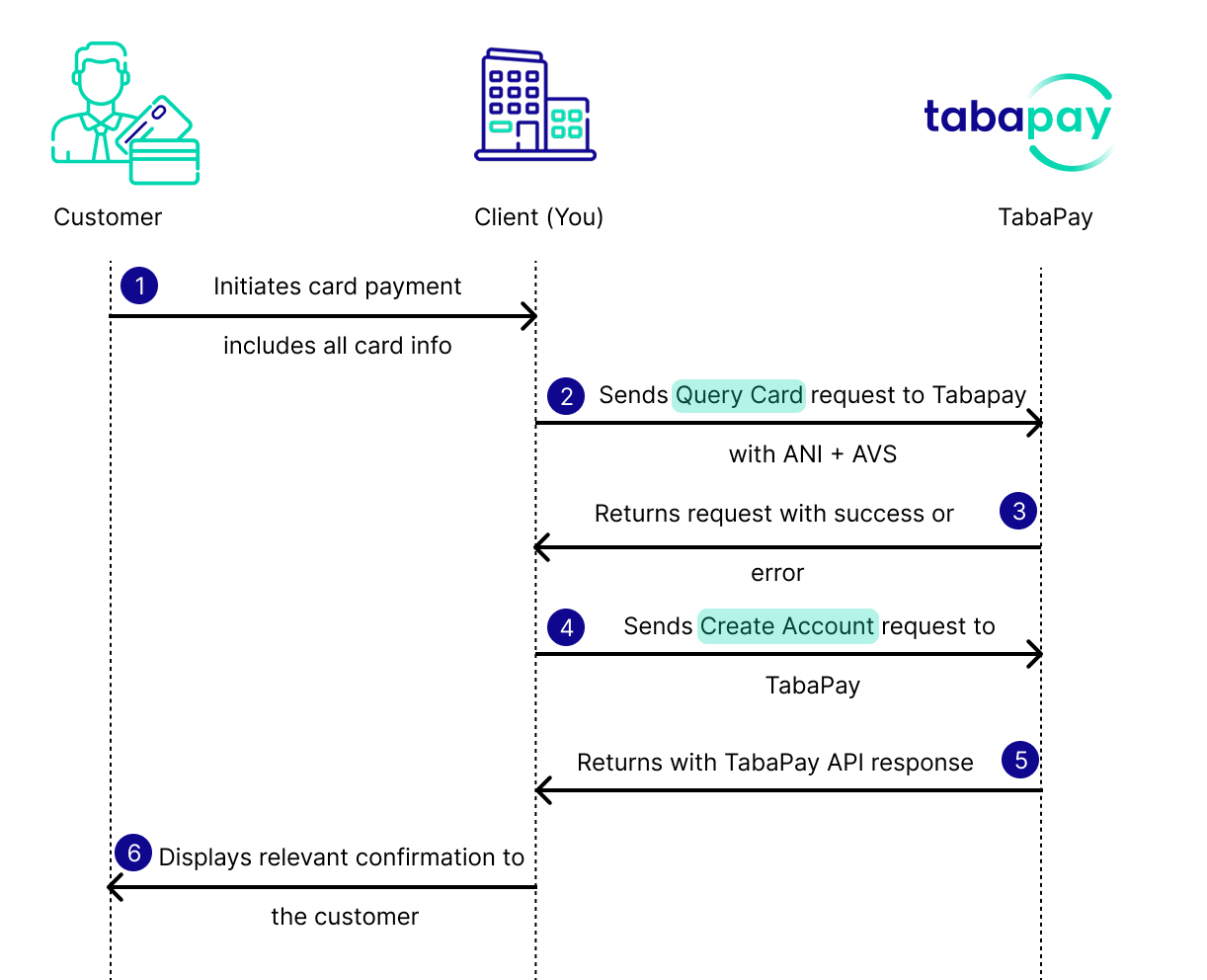 - Use Create Account to create a TabaPay Token (accountID) for the card.