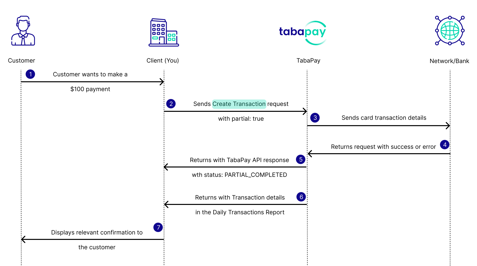 PARTIAL_COMPLETEDand remaining amount of $75.00 - TabaPay later sends the transaction details in the Daily Transactions Report.