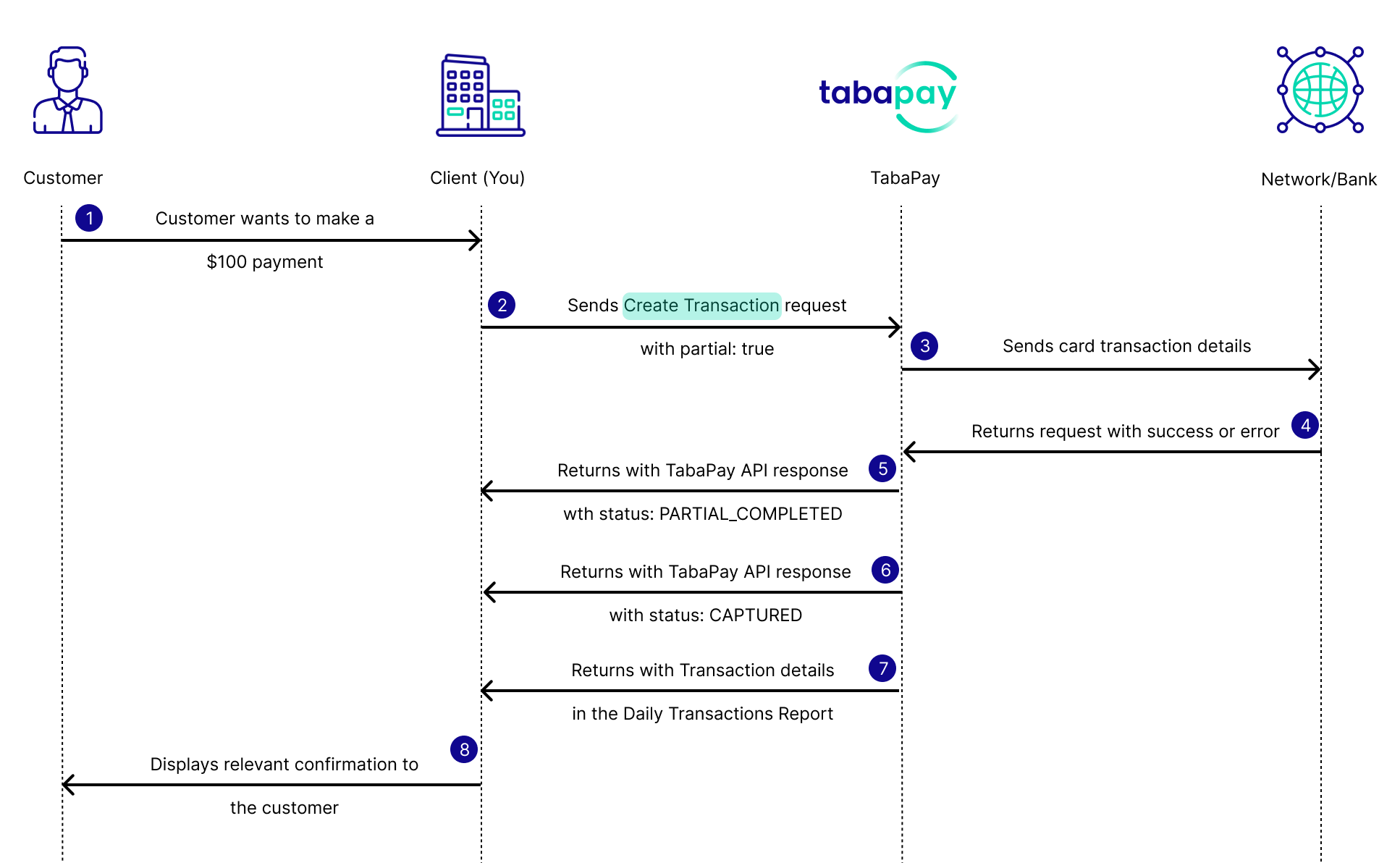 - TabaPay later sends the transaction details in the Daily Transactions Report.