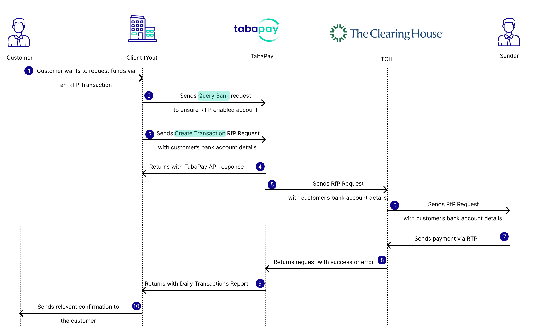 - TabaPay returns the response back to TabaPay Client. Check this page for the possible RTP Return Codes