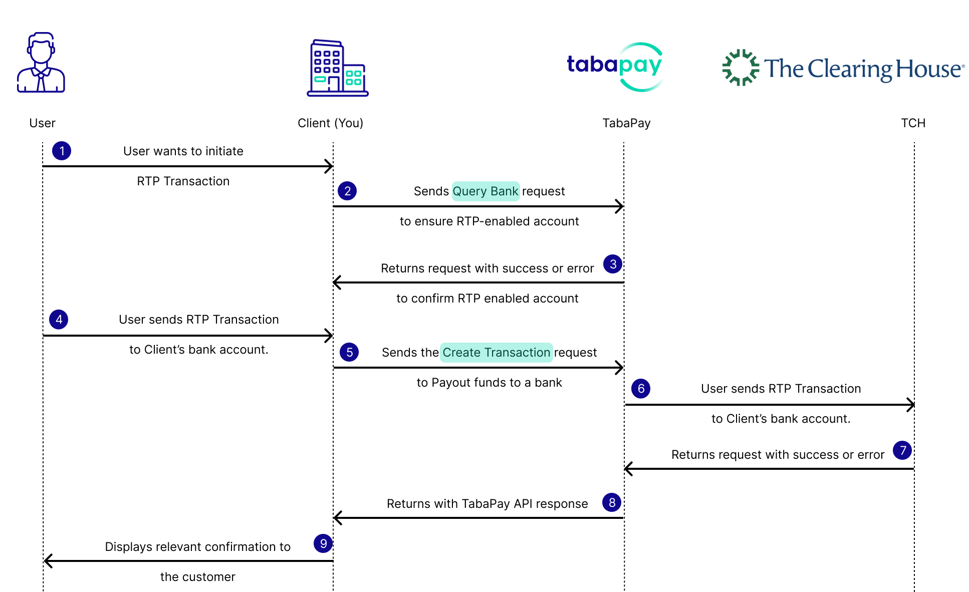 TabaPay enables you to check if the Routing Number of a bank is enabled for RTP. Once you confirm eligibility, proceed to process the RTP RFP transaction using Create Transaction API.